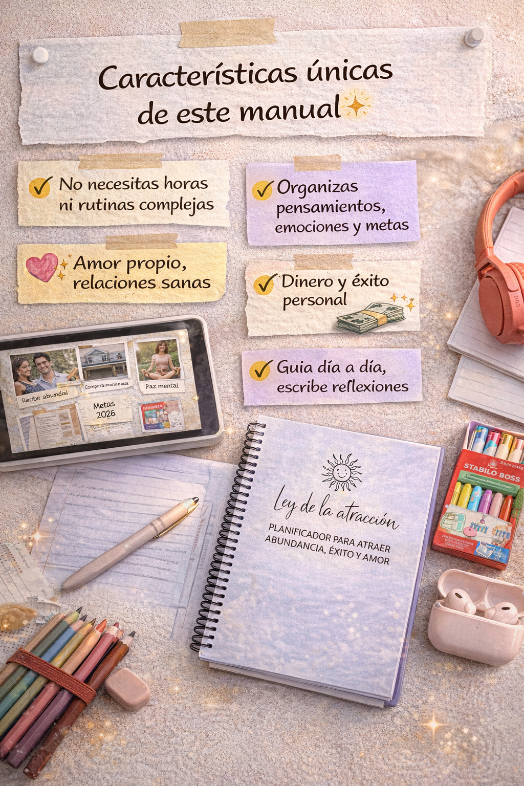 Manifestar no funciona cuando la mente está saturada. Este manual te ayuda a sacar el ruido interno al papel, aclarar lo que sientes y definir qué quieres realmente.